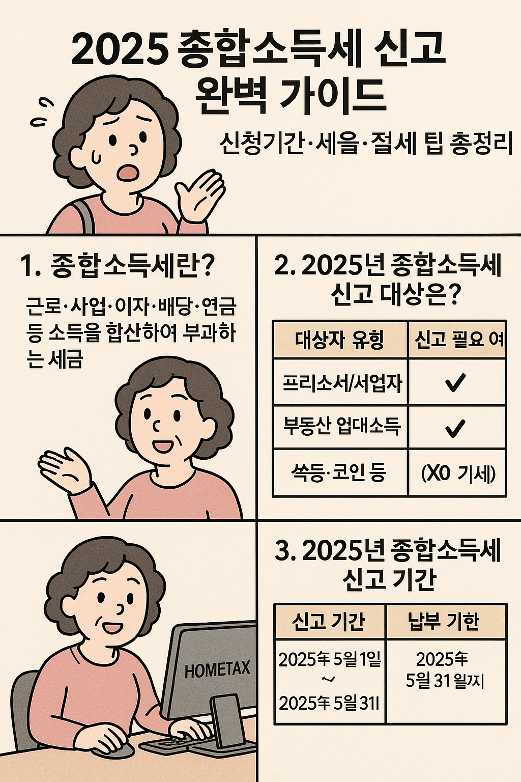 2025년 종합소득세 신고 시즌이 다가오고 있습니다. 프리랜서, 자영업자, 부동산 임대소득자 등 종합소득이 있는 분들이라면 꼭 알아야 할 종합소득세 신고 방법, 세율, 기간, 절세 전략까지 이 글 하나로 정리해드립니다.